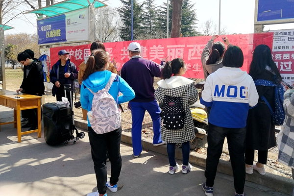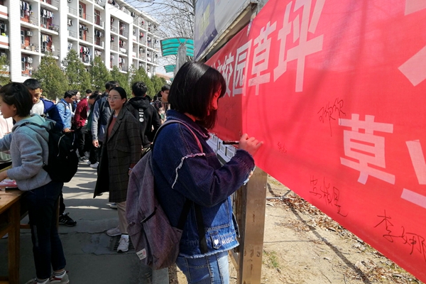 活动前期,一楼一凤 学生会成员紧张策划,积极动员,学院学子响应热烈,为活动的顺利开展打下了坚实的基础。3月11日中午,一楼一凤 学生会在北校区西区雕塑张挂以保护草坪为主题的横幅并邀请一楼一凤 学子签名明志。活动期间,由学生会成员结合本院专业知识进行宣讲,主要为在场人员讲解草坪建植和维护的不易以及被踩过的草坪很难恢复的现状,以此来号召大家不要因为节省时间或缩短路程而随意践踏草坪,宣讲过程中,有不少同学深受感触,前来填写有关校园草坪现状及维护情况的调查问卷,并自愿在横幅上签名以示保护校园草坪之志。