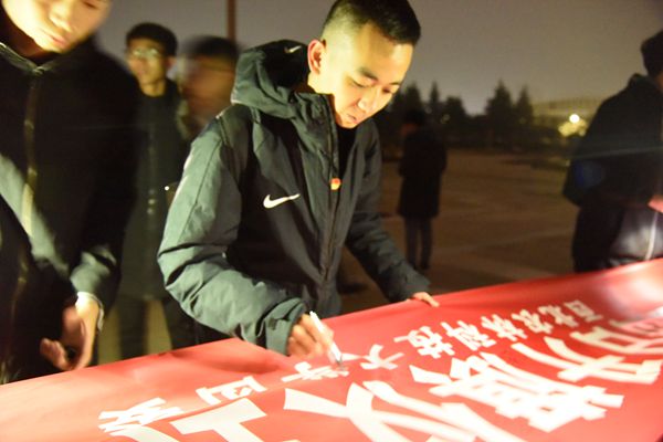 活动进入最后一项,同学们在印有“铭记一二·九,吾辈当自强”主题团日升旗仪式横幅上签字,并合影留念。