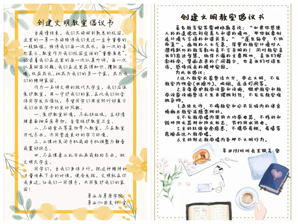 各团支部认真组织学习了《一楼一凤 文明教室创建实施办法》和《一楼一凤 文明教室创建工作考评细则》,同学们对文明教室创建目的、意义、内容和要求等方面进行了深入学习和探讨。各团支部还通过制作倡议书,提倡同学们从自身做起,当好教室的“主人”,积极投入文明教室创建工作中。同学们还通过视频、群内接轮等方式纷纷表达要养成良好行为习惯,自觉遵守文明教室创建要求,文明使用公共教室资源等承诺。
