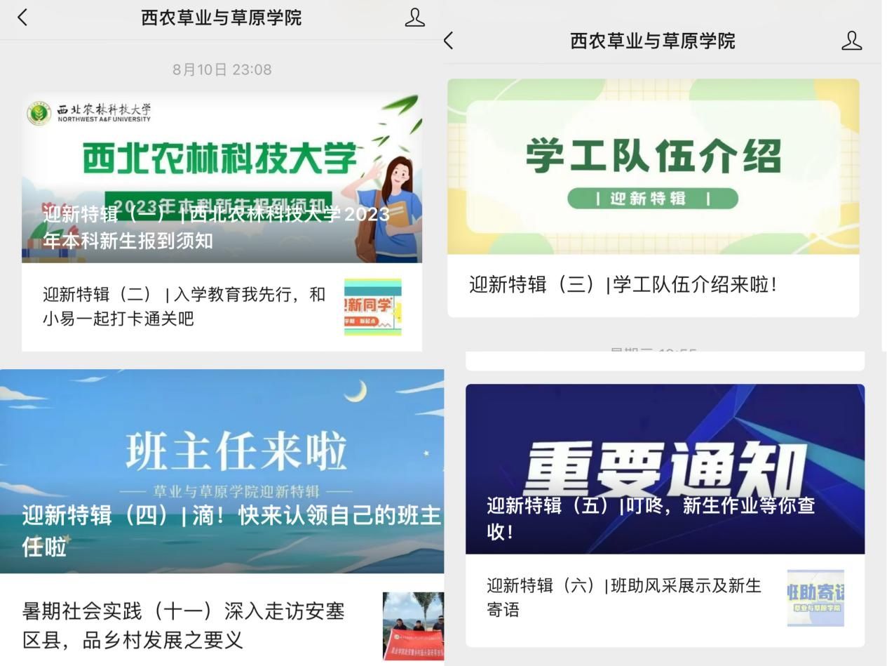 利用微信平台推送“入学须知”“学工队伍展”“班主任寄语”“班助风采展”等迎新特辑,打造“新生作业”与“新生才艺show”融合专栏,增进新生认知、激发新生主动融入的内生动力,凝聚师生合力为新生顺利入学保驾护航。