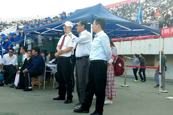 院长呼天明和党总支副书记兼副院长阮鹏为运动员加油