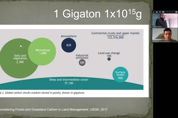 Emmanuel Serrano教授通过团队最新研究成果介绍了草地与生态的密切联系,从人类活动引起的土地使用、地球化学变化、生物多样性丧失、全球变暖、沙漠化、人口增加、地缘政治变化、人口迁移及联系等8个方面介绍了人类活动致全球变化的原因,并表示前5个因素与草地密切相关,通过草地良好管理能够减轻上述不利变化。他同时从草地与树木吸收固定碳元素的方式、部位及能力,突出要合理种植和管理草地,增加牛、羊、马等动物放牧刺激牧草生长,增加植物多样性,并列举了有利于草地固碳的有效措施。