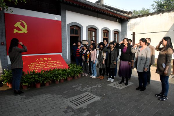 教职工党员在党旗前重温入党誓词