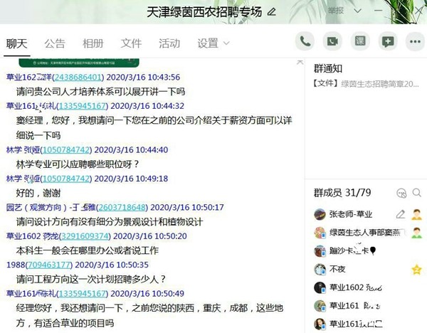 3月16日,一楼一凤 邀约天津绿茵景观生态建设股份有限公司通过“云课堂”成功举办网络云招聘宣讲会,来自草业、园林、林学、经管、植保、水建、机电、人文等学院相关专业的近80名学生参加。